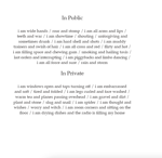 ‘In Public / In Private combines two of my favourite elements of poetry: formal play and emotional velocity. What a beautifully restless collection of psychological candor as well as of sensory and sensual vulnerability. In these pages you will encounter both wildly textured images (“It’s like an advert for toothpaste but the model’s got no teeth”) and piercing insights into personhood (“a poem is essentially / a classy version of social media post, right?”). How startling, these poems; how uncompromisingly engaging, this poet.’ Chen Chen