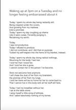 Katie is an autistic and physically disabled writer who creates performance poetry and interdisciplinary poetic storytelling for theatre. They write complicated metaphors about serious things, like sickness, loss, and love. Their writing is highly