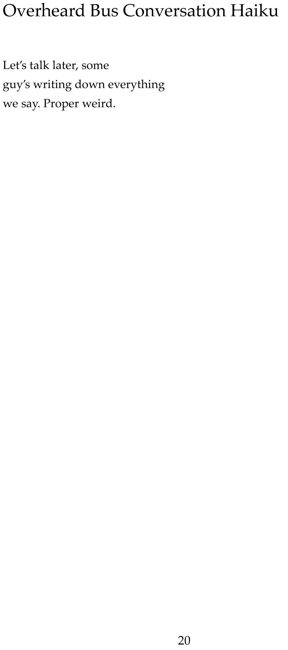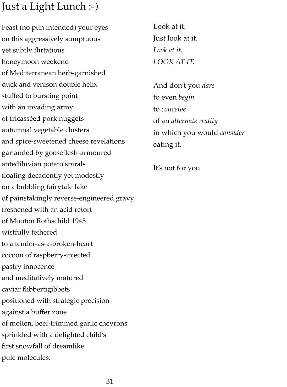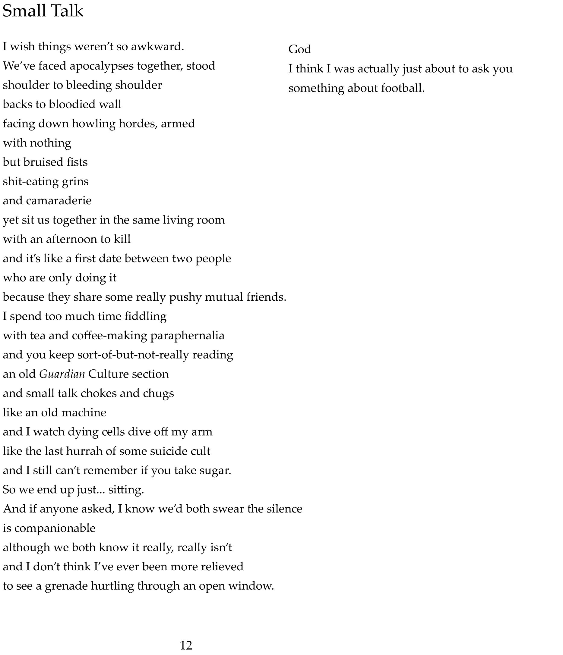 The world is a confusing, terrifying, exciting, sexy, smelly place that makes simultaneously more and less sense the more time you spend in it. This collection of poems, poem-shaped rants, rant-shaped monologues, whimsical asides, imagined conversations, mutated anecdotes and existentially terrified howls at the moon is about as pure a manifestation of Stef Mo's (Stefan Mohamed) relationship with the world as you could hope to experience, short of piloting a miniaturised submarine directly into his brain. This, incidentally, will be the delivery mechanism for his second collection, except he'll be in the submarine and it'll be your brain.