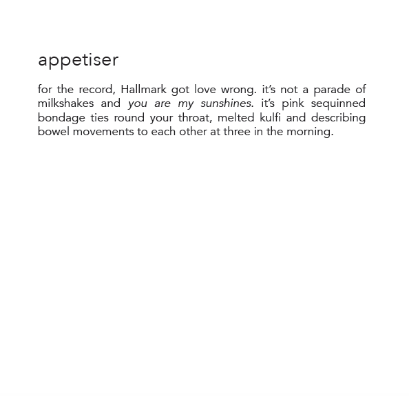 [re:desire] draws upon literary traditions and cultural references to flip the male gaze common in mushairas on its head. Common themes for mushairas are love, God and being drunk or intoxicated by love and God – but is usually seen from a male perspective. The pieces in re: desire are mainly told from a female perspective, and question the gender given to particular acts, objects and ideas.