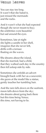 In the sequence's connecting poems, Venus's progression from innocence to experience is mirrored across numerous arrivals, departures, journeys and landscapes; from a dancing mother to a psychopathic Barbie, murderous mozzarella and a road trip across the Spanish Badlands. By viewing Venus as everywoman, outsider, traveller and immigrant Lydia explores how women in particular are viewed and affected by cultural, political pressures in contemporary Britain and beyond.